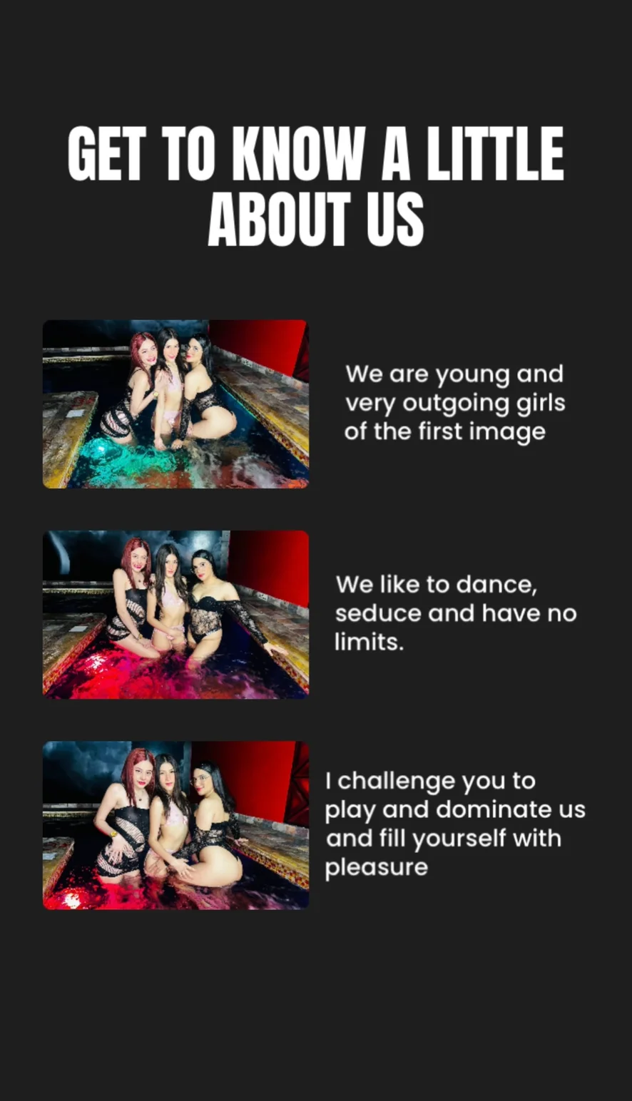 Doggy Style, Selkäsauna, Eroottinen tanssi, Tupakointi, Suihinotto, Syväkurkku, Hieronta, Runkkaus, Masturbointi, Pillun nuoleminen, FUCK HER THROAT GAG NASTY, FUCKING PUSSY HARD, Suukapulointi, BRUTAL ANAL DESTROY, Tuhmat puheet, Anaalilelut, Vilauttelu, Jengipano, Gape, Nöyryytys, Orgasmi, Fistaaminen, Tupla penetraatio, Anaali